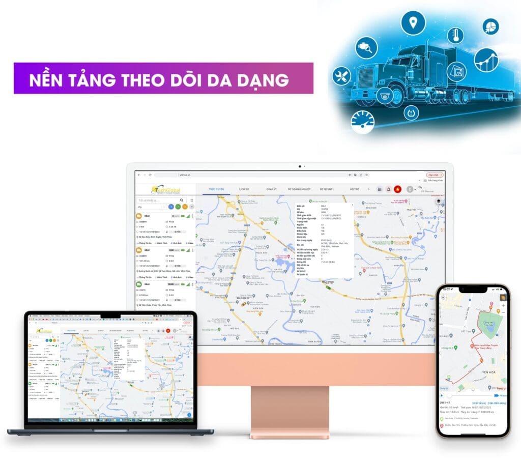 - Web: theo dõi nhiều xe, xem báo cáo hành trình, vi phạm.